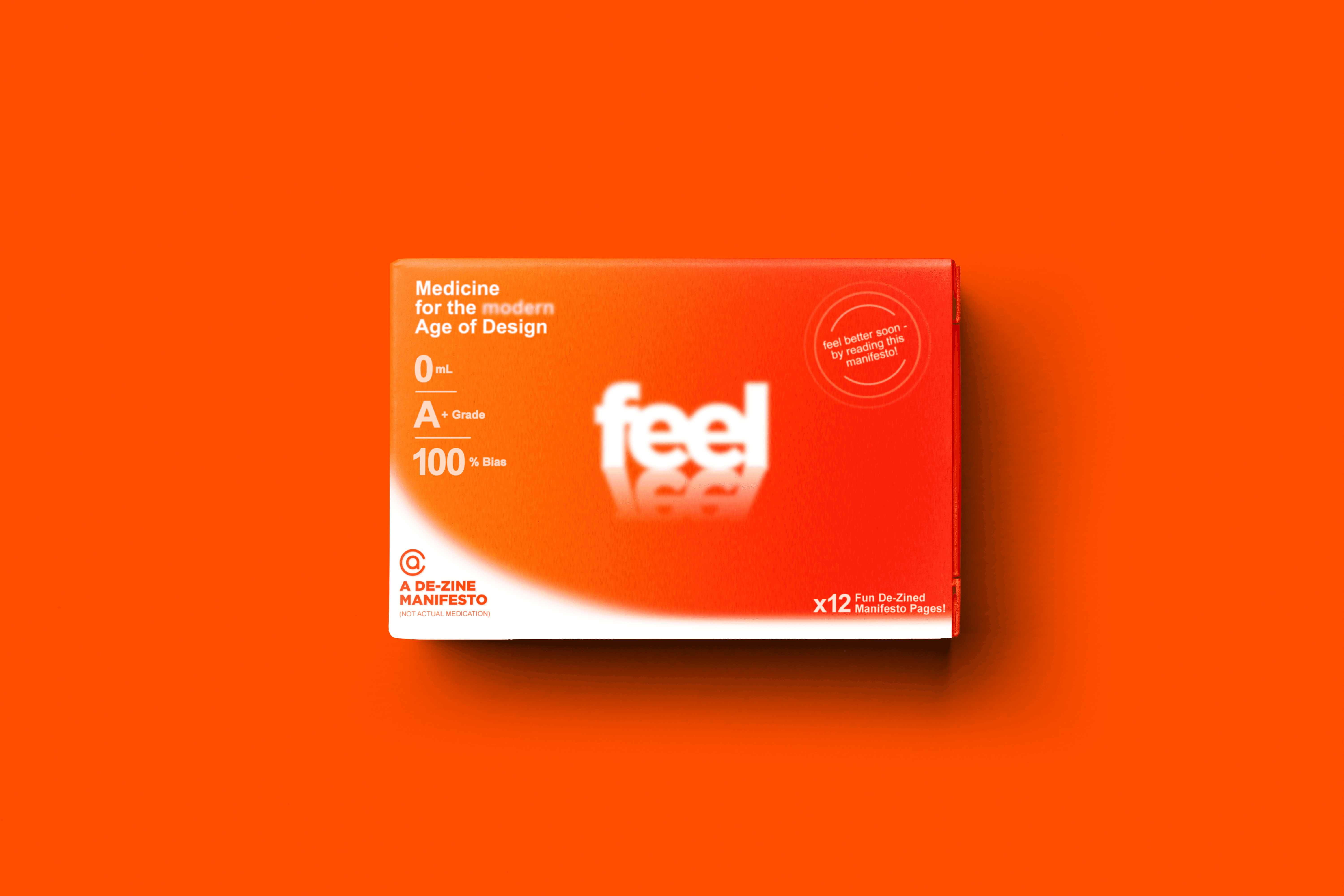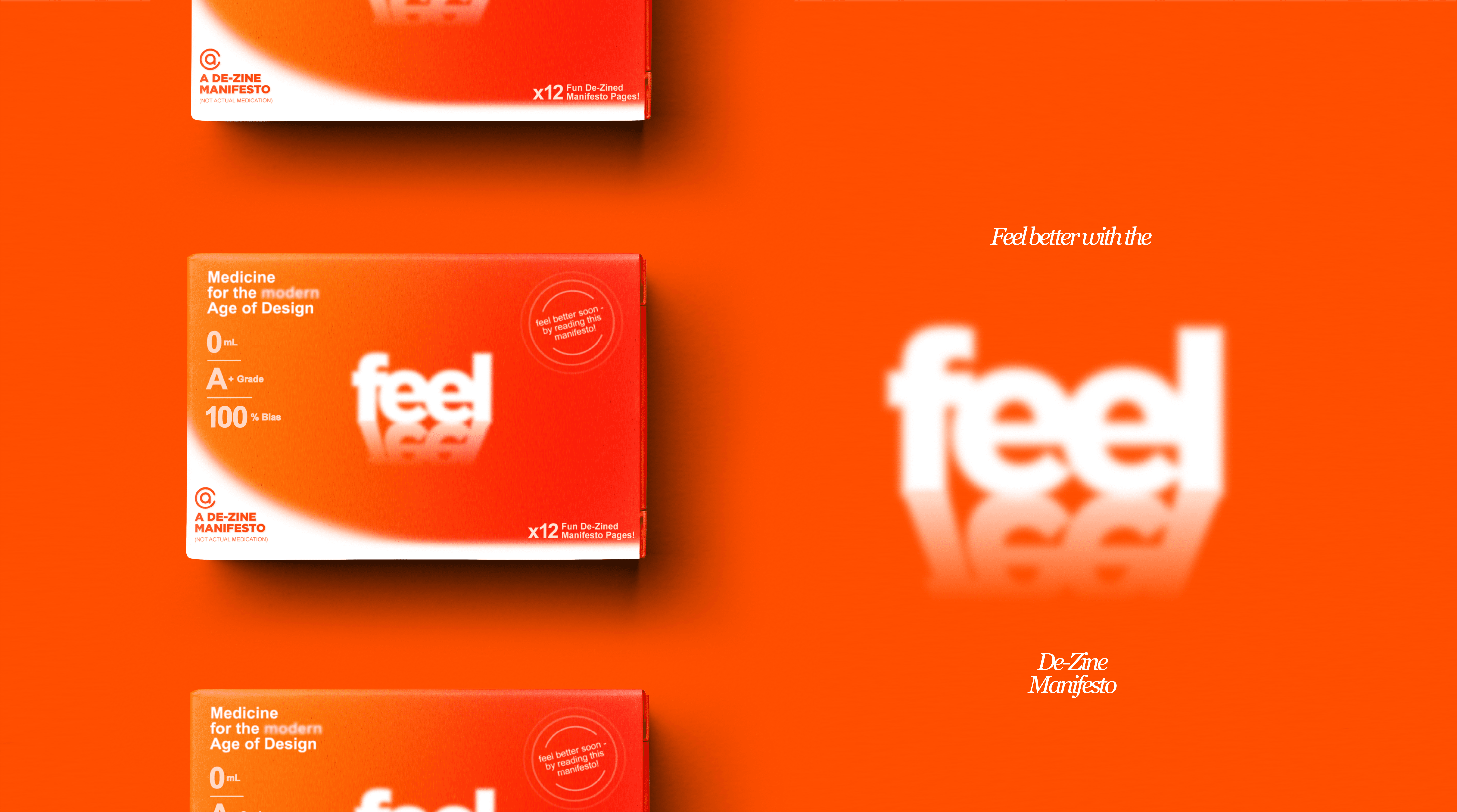 Graphic designers today are overworked and overlooked; even Google cannot properly define what a Graphic Designer really does for a living. The 'Feel De-Zine Manifesto' explores my own personal experiences in what it's like today being a Graphic Designer and how AI has diluted our job and our reputation. Satirically packaged in humorous medical packaging, the manifesto is purposed to make people, not just graphic designers, ultimately feel better and heard about our constantly changing era of design.
